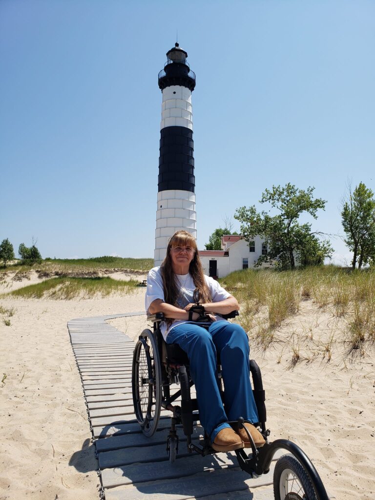 Kim Anderson (tetraplegia) – I bought my Freewheel a few years ago, and the freedom it has provided me is worth the investment! Recently my husband and I went on vacation in Michigan, just a 6-hour drive from Cleveland, and I took my Freewheel. I’m glad I did because I would have missed seeing this amazing lighthouse in the photo if I hadn’t. The only way to get to the Big Sable Point lighthouse is to go down a 2-mile sand/gravel hiking path. With the Freewheel (and a little help from my husband), I was able to get to the remote lighthouse, have a picnic, see the beautiful blue waters of Lake Michigan, and see the sandy dunes. Without the Freewheel, I would never have been able to access that environment, and I would have missed out on creating a wonderful memory.