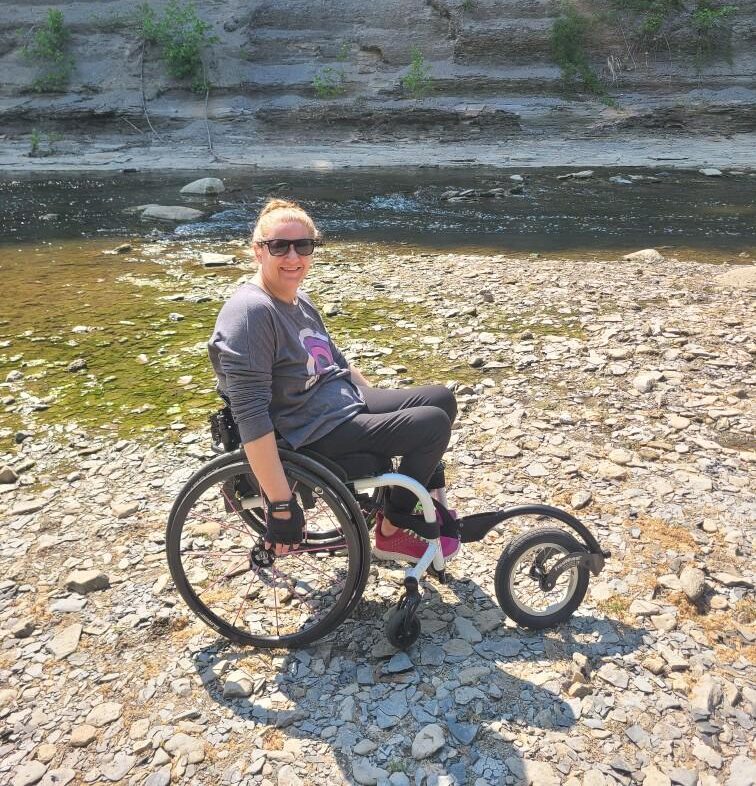 Megan Hammond (paraplegia) – Watching content creators on Instagram, my desire to own a FreeWheel grew slowly, and now I am obsessed. My fiance and I started exploring trails in Northeast Ohio and would often pass an “off-road” trail, thinking, “That would be cool to explore,” knowing in my regular wheelchair, it would be very difficult to do. Then, after receiving the FreeWheel as a Christmas present, my thinking turned to, “What else can we explore.” I love getting out in nature and learning that Northeast Ohio has some amazing views! The FreeWheel has opened up new adventures for me, and I learned that I loved hiking.