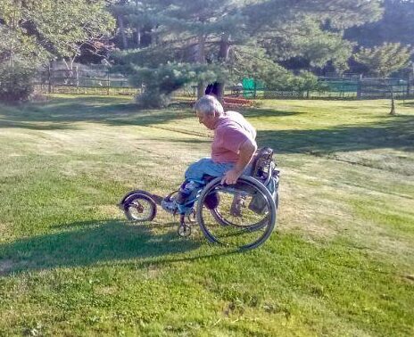 Don Johnston (paraplegia) – The Freewheel is a wheelchair device that has opened up opportunities for me that enhance my exercise options. With the easy footrest connection, I’m capable of pushing my wheelchair through grassy areas and rough terrain. With this attachment, I am able to focus on staying in shape, working on my endurance, and increasing my breathing capacity. I have been able to use my strength and push my chair in areas where I don’t normally travel. Using the Freewheel so far has been a blast!